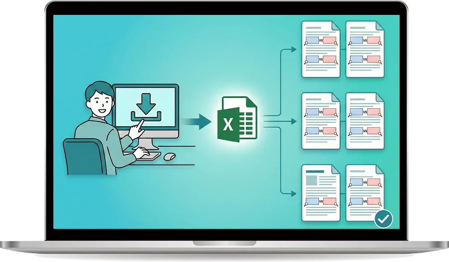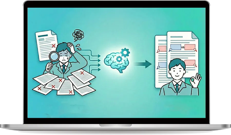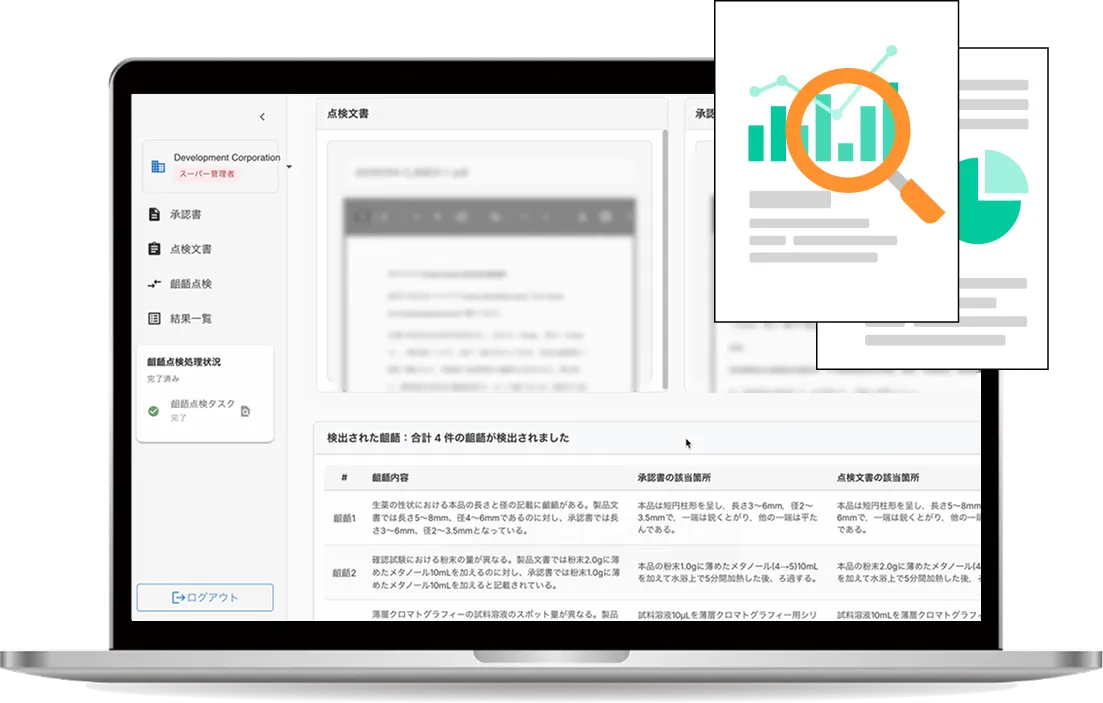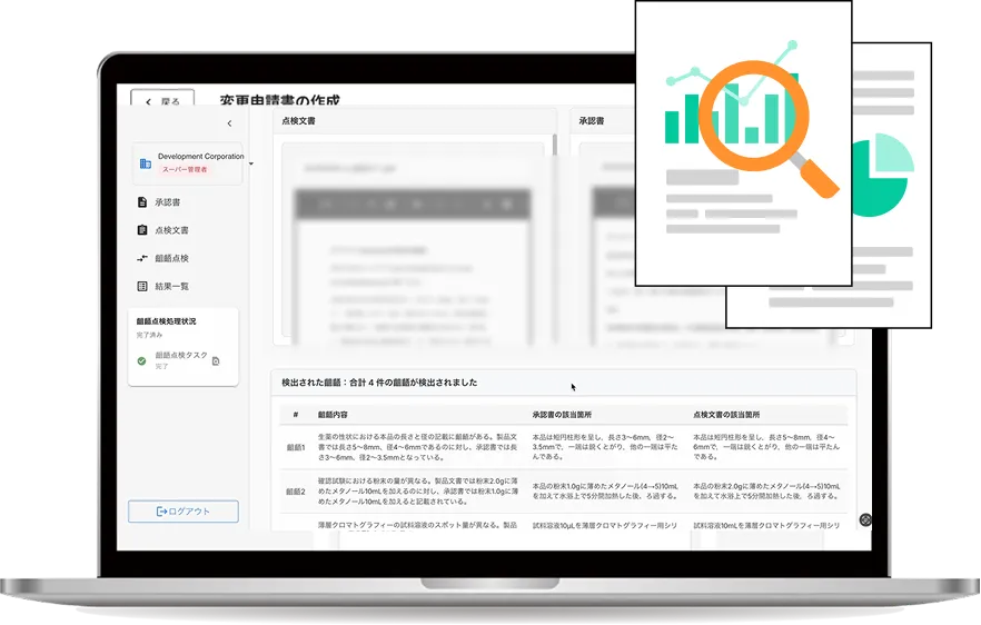 QAI Checkerは、承認書・製造手順書など複数文書をAIが読み取り、段落単位で齟齬箇所を抽出する品質保証向けチェックシステムです。数値の相違・工程の抜け漏れ・表現の不一致などを自動で洗い出し、レビュー工数を大幅に削減します。